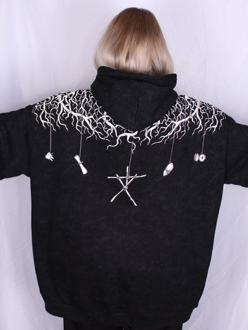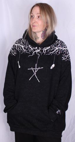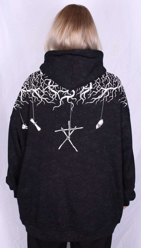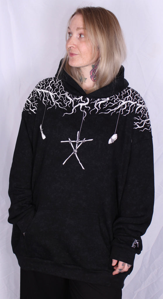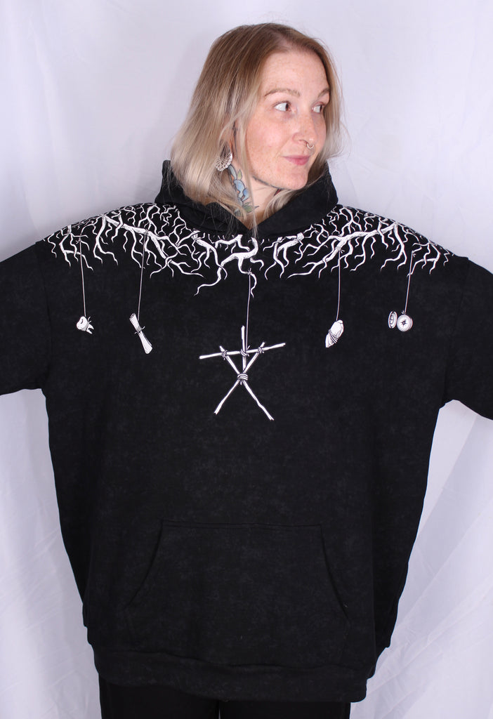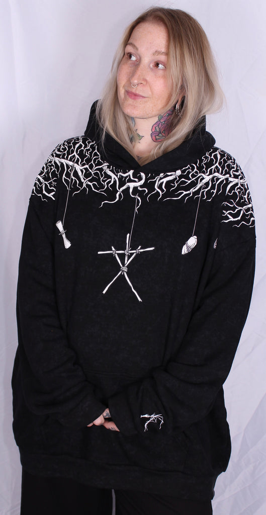 This Burkittsville heavyweight hoodie is the perfect blend of comfort, high quality and design! The acid wash finished, heavy weight fabric is adorned with printed neckline details. It has logo embroidery on one sleeve and branded hem tag at the bottom. This is designed to fit oversized, so if you want a normal fit, downsize by 1 size.